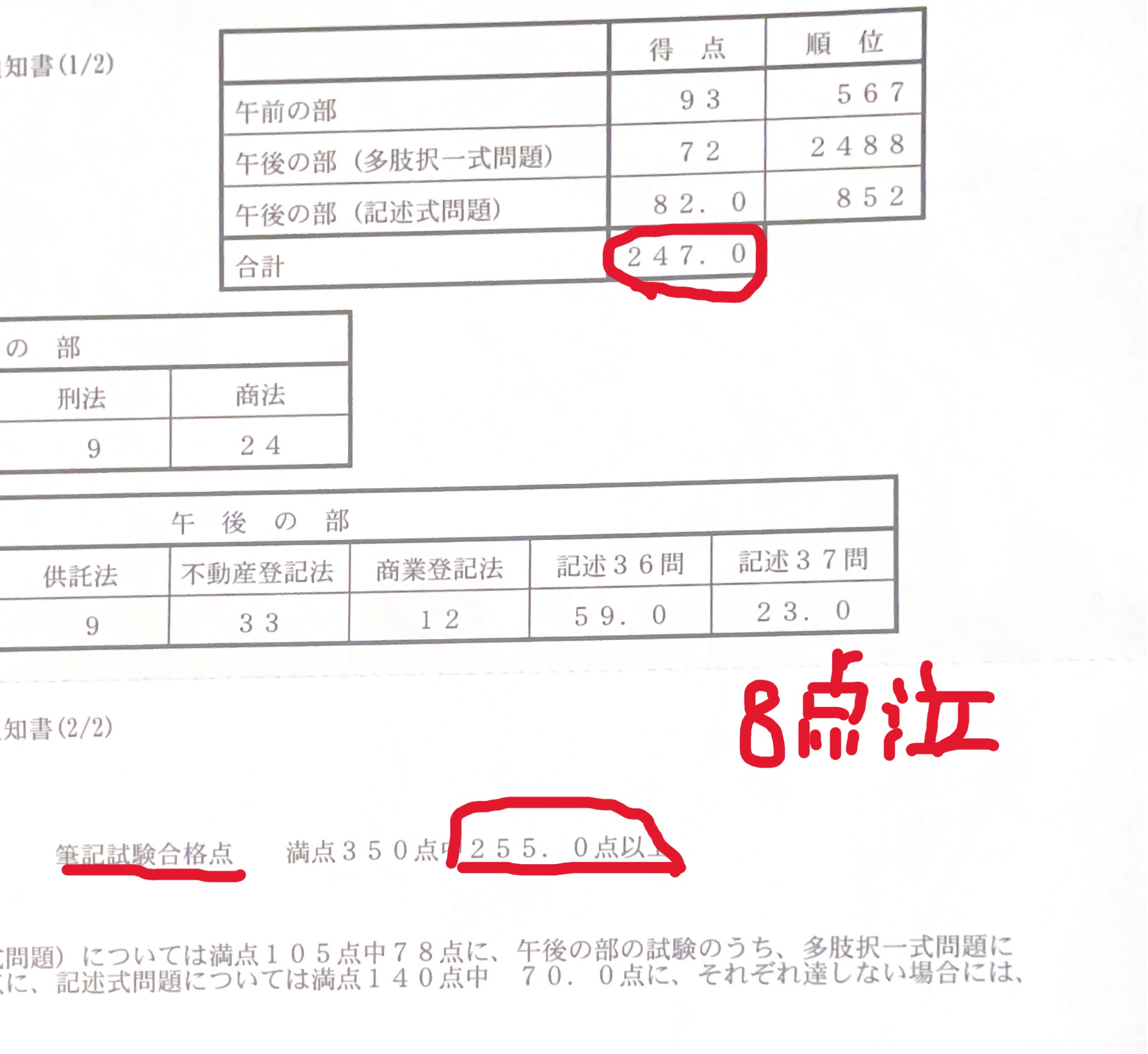 合計247点/350点で合格点の255点まであと8点でした。