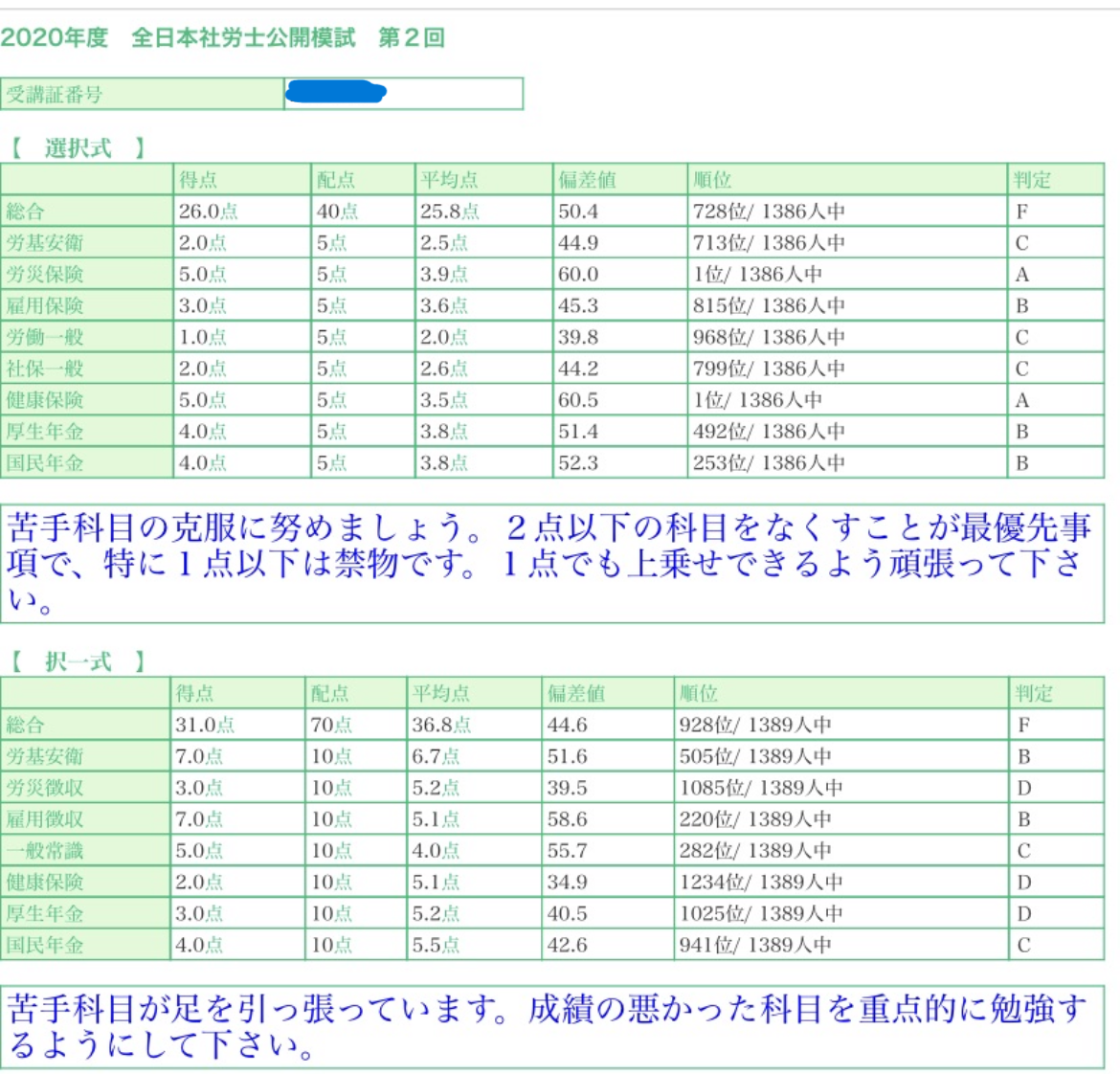合計 26点 →偏差値50.4 順位728位/1386位 判定 F