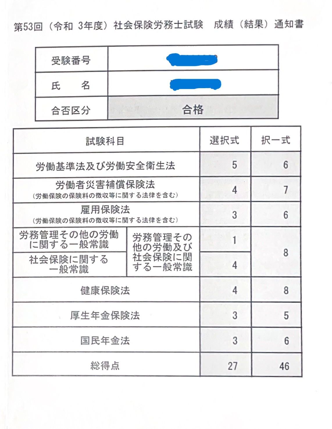 合計 28点 →合格点は25点のため、総合点はクリアしているが、労一で足切り